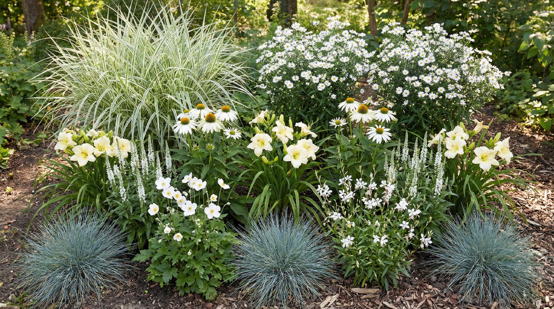 Bílá harmonie (Bíle kvetoucí záhon s travinami)