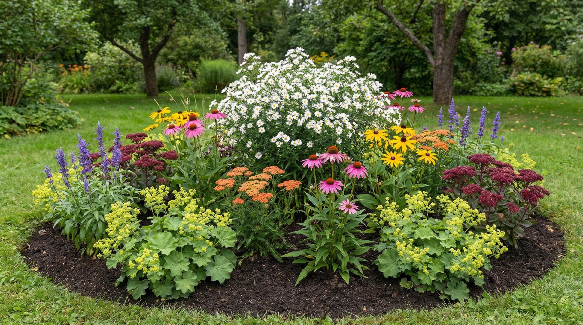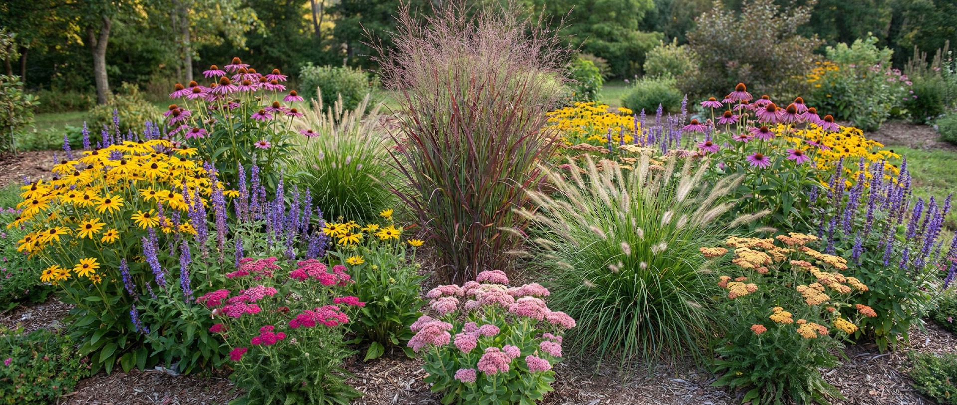 Barevná symfonie (Barevně kvetoucí záhon s travinami)