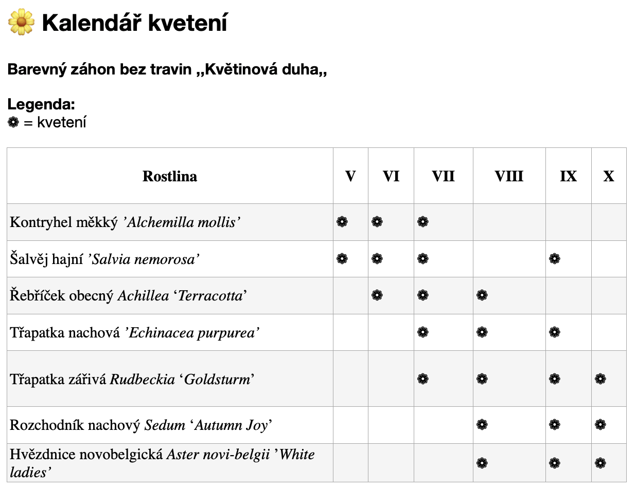 Květinová duha nabízí spektakulární barevnou show od června do října s postupným kvetením jednotlivých druhů. Začíná kontryhelem a šalvějí, následují třapatky a řebříček, vrcholí astrou a rozchodníkem. Kombinace barev - bílá, růžová, žlutá, fialová, oranžová a vínová - vytváří skutečnou duhu v zahradě.