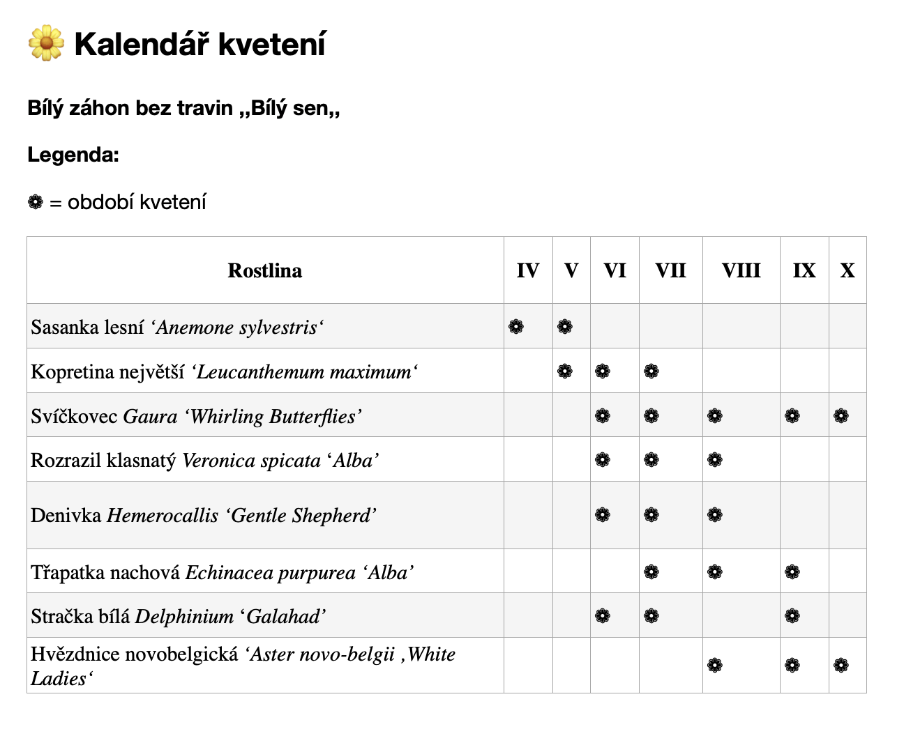 **Rostliny v záhonu Bílý sen:**